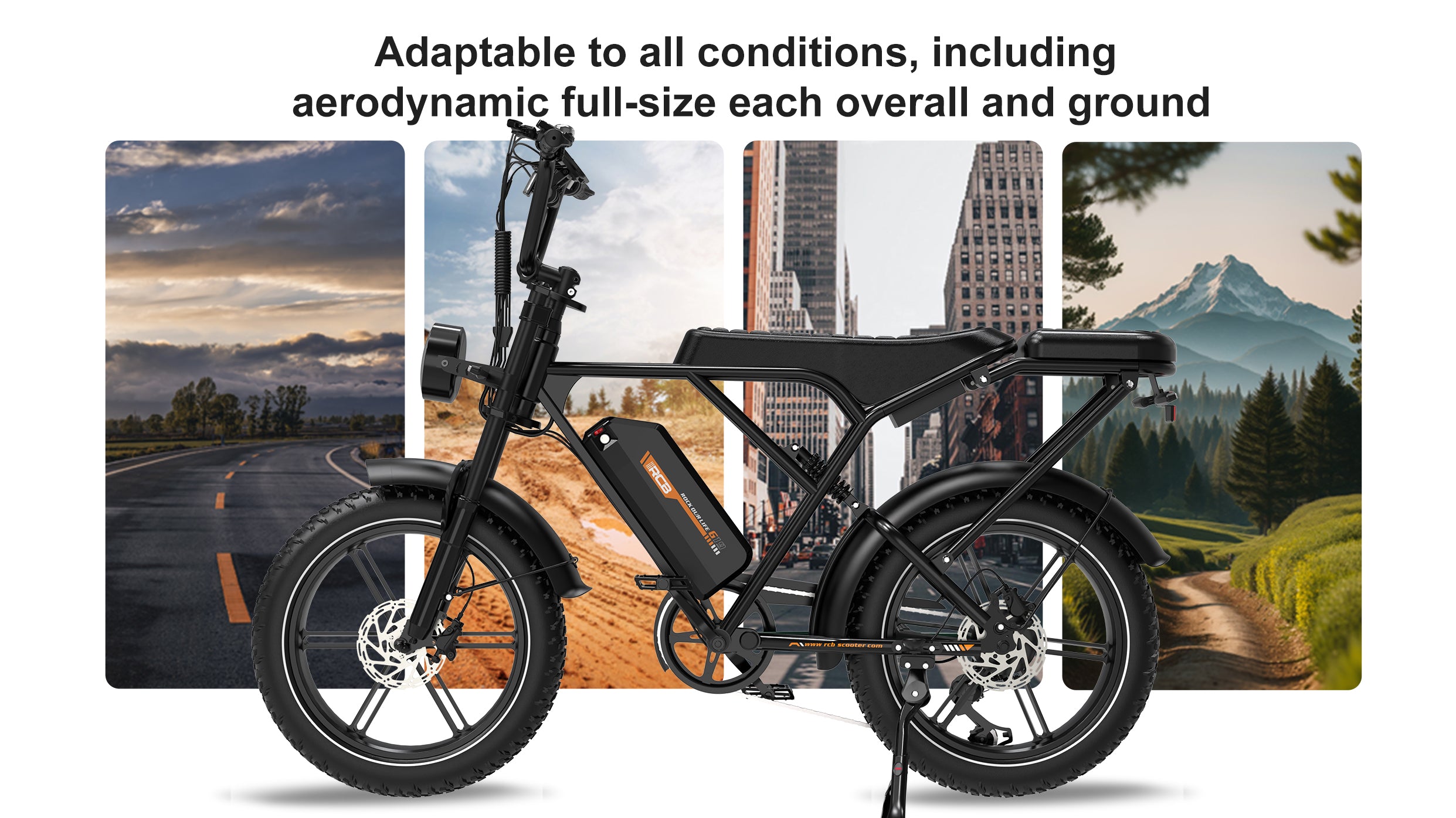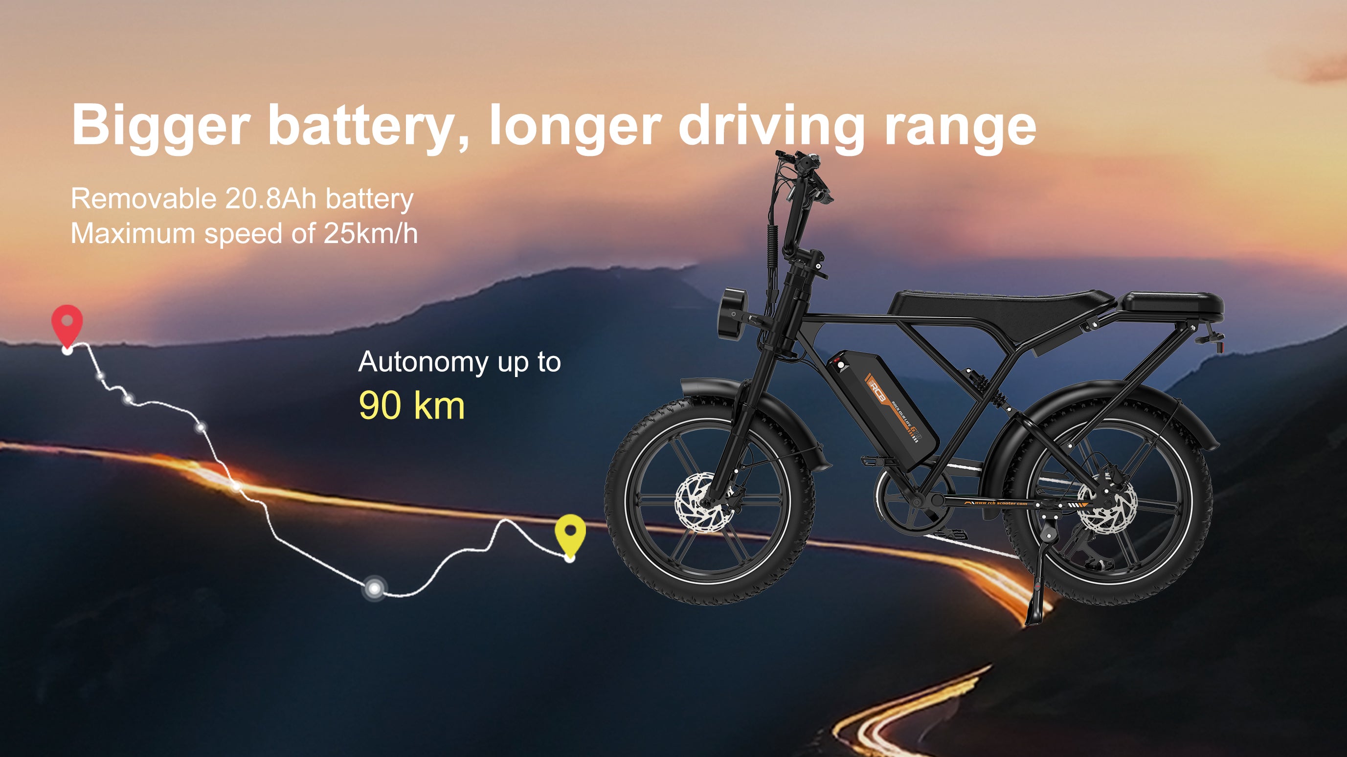 Larger battery, longer battery life, removable 48V20.8Ah battery, maximum speed 25 km/h, maximum power-assisted battery life 90KM.