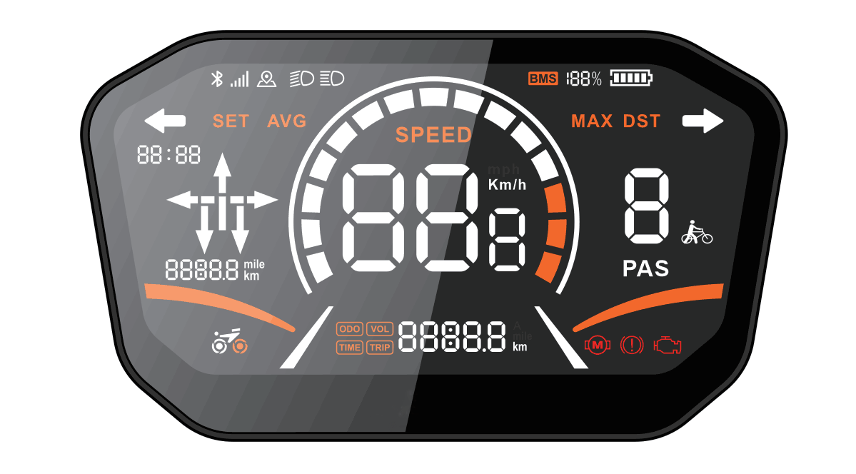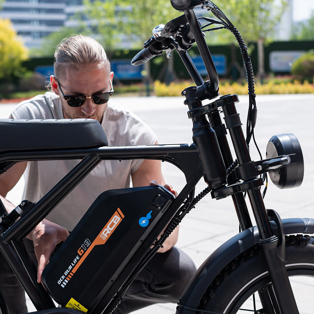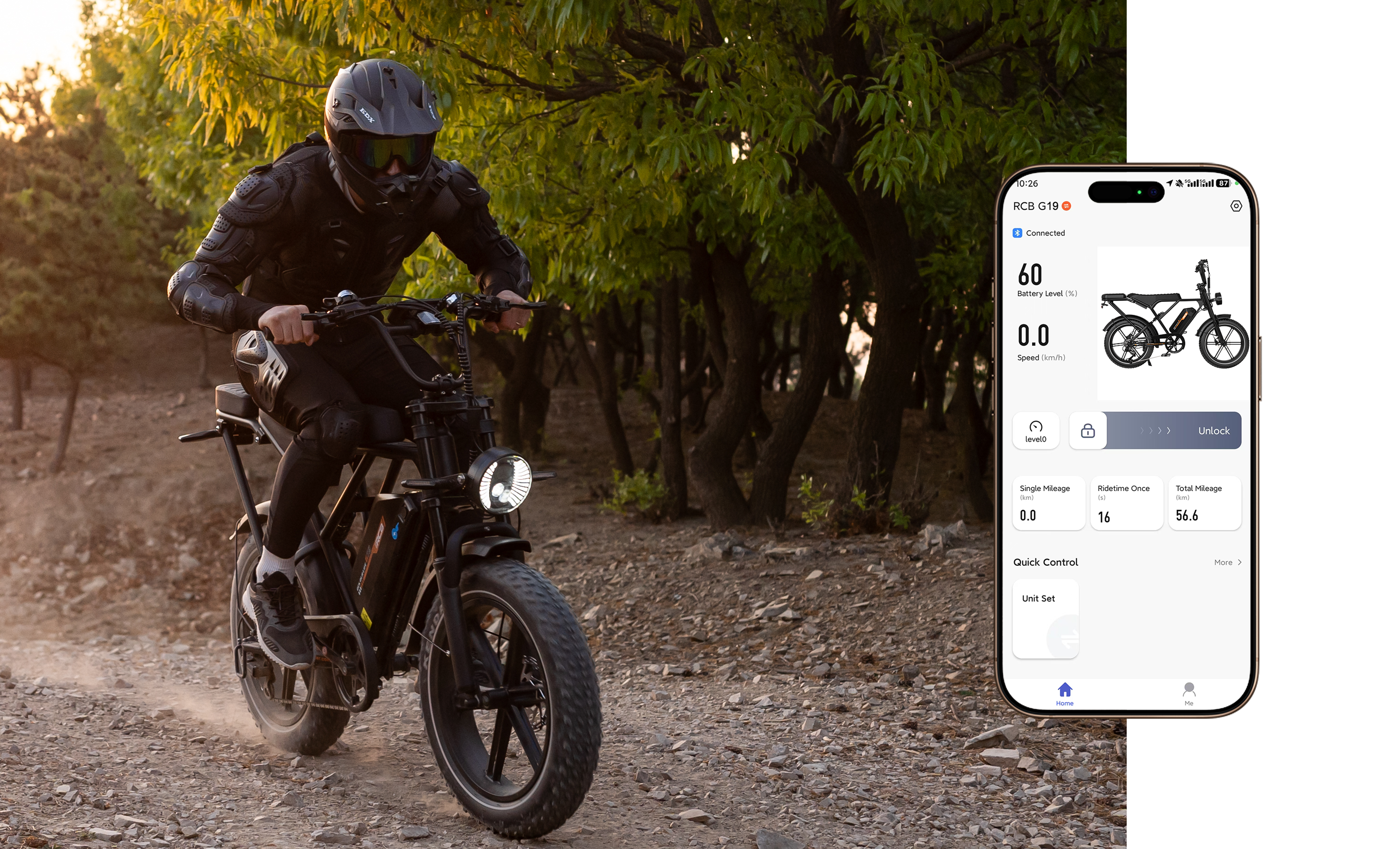 The RCB G19 lithium-ion bike can be controlled by an APP with a color LED display, which displays speed mode, battery life, riding data, lights, error codes, etc. It also supports NFC unlocking.