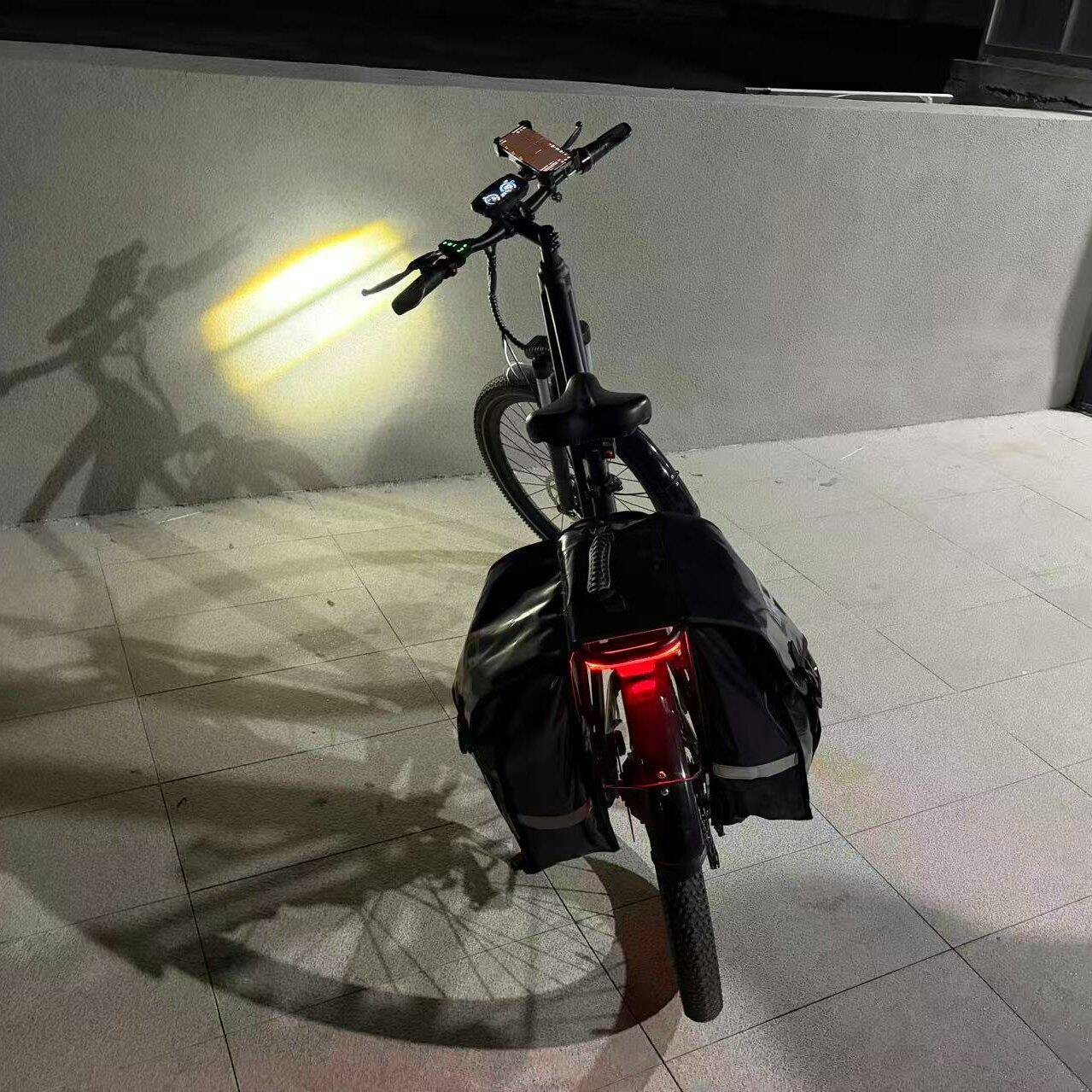 Includes LED LCD display, dual front headlights with up to 15 meters illumination distance, and side-mounted rear taillights for nighttime safety.