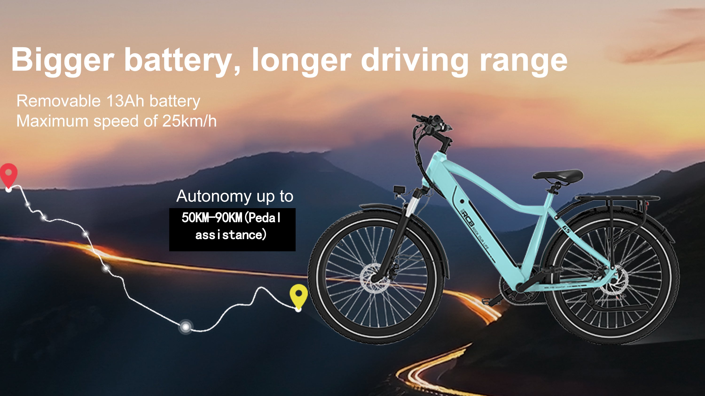 The RCB G5 electric bicycle has a 36V 13Ah battery capacity and a range of 50-90 kilometers (depending on battery capacity and usage).