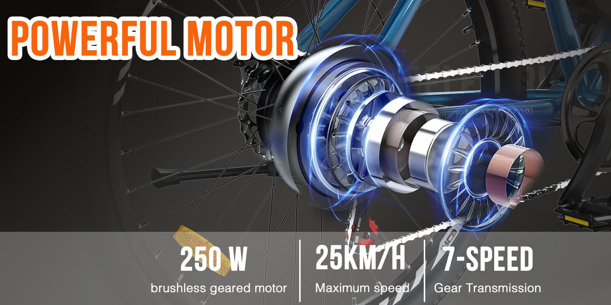 - Powerful power: Equipped with a powerful 250 watt motor, it generates enough energy for your daily journey and for the different environments you pass during your exploration tours. With a speed of up to 25 km/h, you are at your destination in no time.