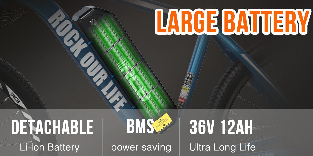 RCB is equipped with a 36V 12Ah detachable IP54 waterproof lithium-ion battery